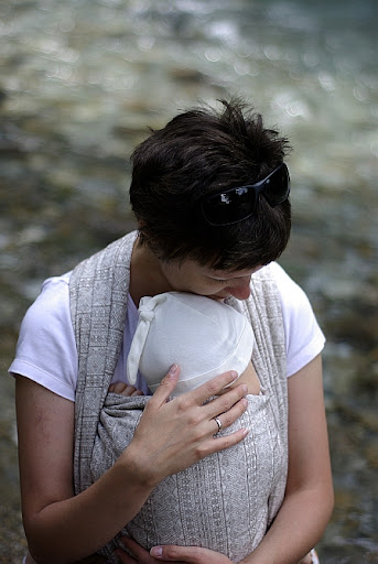 Nie mogłam się go doczekać (dłuuugo płynęło), a kiedy już dotarło... rozczarowałam się - to była całkiem inna chusta niż znana mi terra. Taka jakaś szmaciana, płaska, śliska, bez wyrazu... tak cienka, że wrzynała się w ramiona. Zawiązałam ją ze dwa razy i wylądowała w kącie. Potem, w listopadzie, na warsztatach chustowych, pożyczyłam ją wieloletniej forumowej koleżance dla jej nowo narodzonej córeczki. Pożyczyłam i nie było jej przez kilka miesięcy. Koleżanka mówi, że nie nosiła w niej nawet dużo, bo bardziej przypasowała jej chusta kółkowa. Chciałam rotbuche sprzedać zaraz jak tylko z powrotem do mnie dotrze.