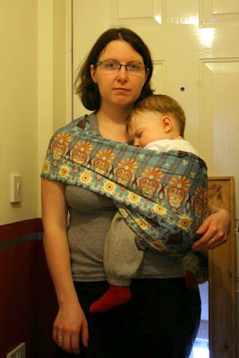 Nabylam sobie Indian Summer, ale jakos nie mam przekonania do slusznosci rozmiaru. Wiekszosc ma problem z tym, ze pouchyk jest za duzy, a ja nie wiem, czy moj nie jest za maly. Wszystko byloby ok, gdyby nie fakt, ze mam wrazenie, ze chusta wpija mi sie w ramie - baardzo. Dzieciowi chyba dobrze, bo zanim zdazylam zrobic zdjecie (wyjatkowo nie twarzowe) zasnal. Co myslicie, za mala?