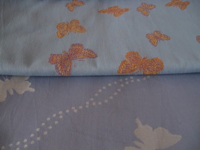 Natkowy niebieski jest szary, idealnie współgra ze srebrnymi motylami. Obie chusty sa bardzo udane moim zdaniem.