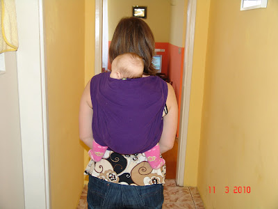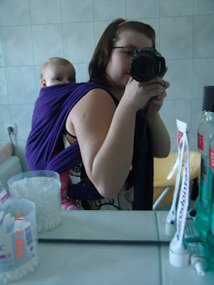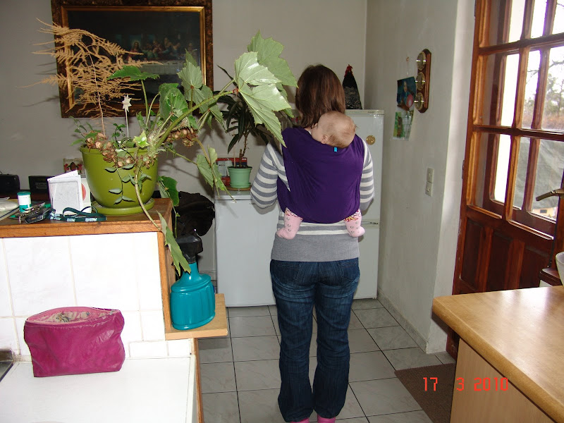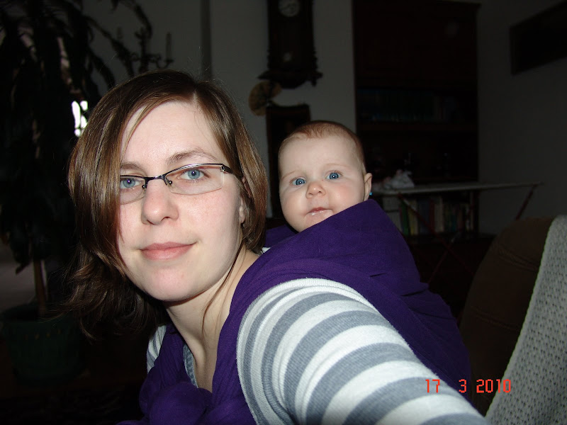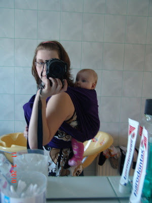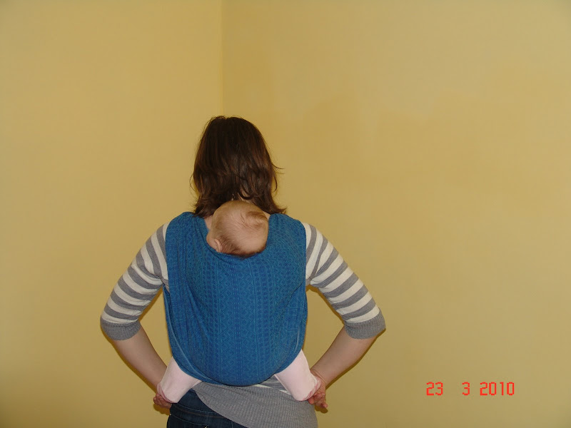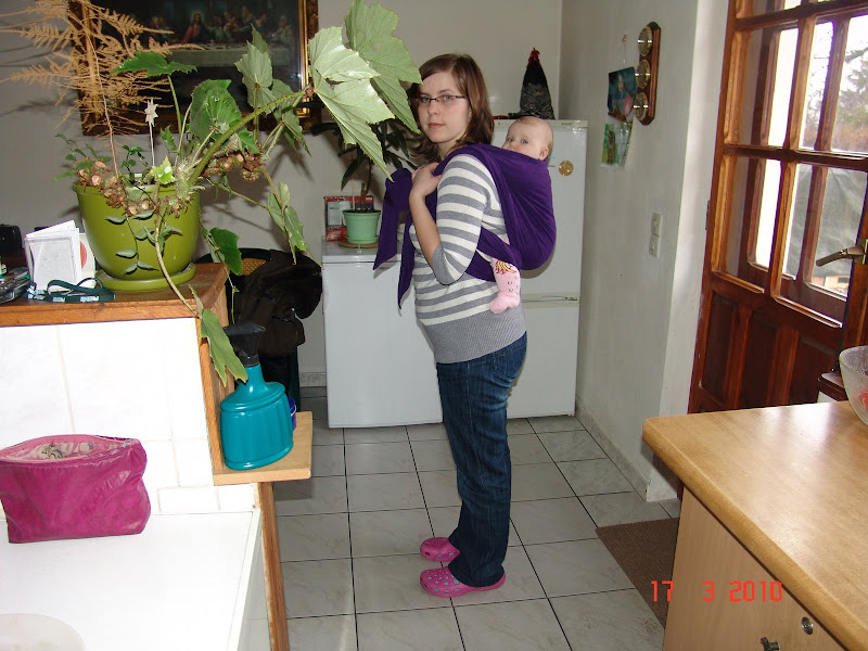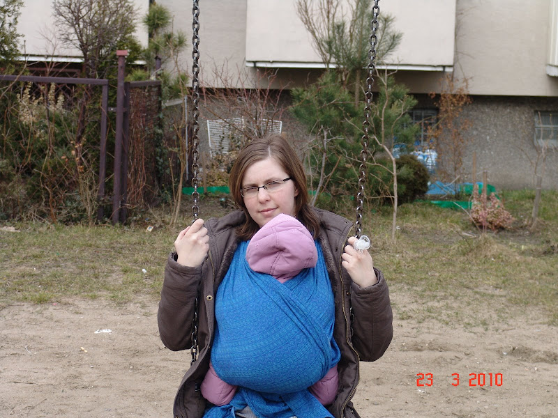 Pomęczyłyśmy się trochę - tzn. ja, bo Joasia już przy trzeciej próbie poddawała się temu co z nią wyczyniam- i wyszło tak jak na fotkach. Było wygodnie, pochodziłyśmy trochę po mieszkanku, po czym musiałam wyciągać niunie bo pięknie ulała na mój kark