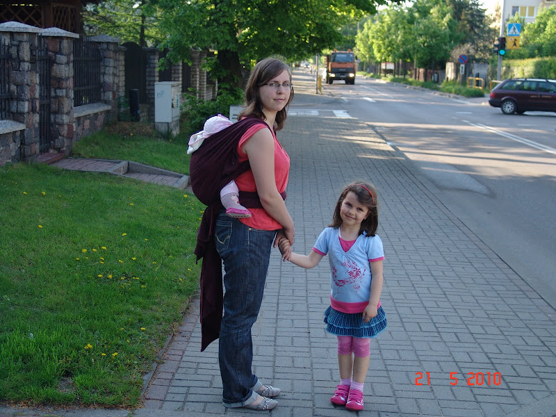 Dziunka, piękny plecakPiszesz że się spociłaś bardzo, to dlatego że mała była za grubo ubrana, ty miałaś bluzkę bez rękawków,a ona widzę że bluzę ma i na to chusta, ja uważam że za dużo. powinna być w body i coś na nóżki + czapka